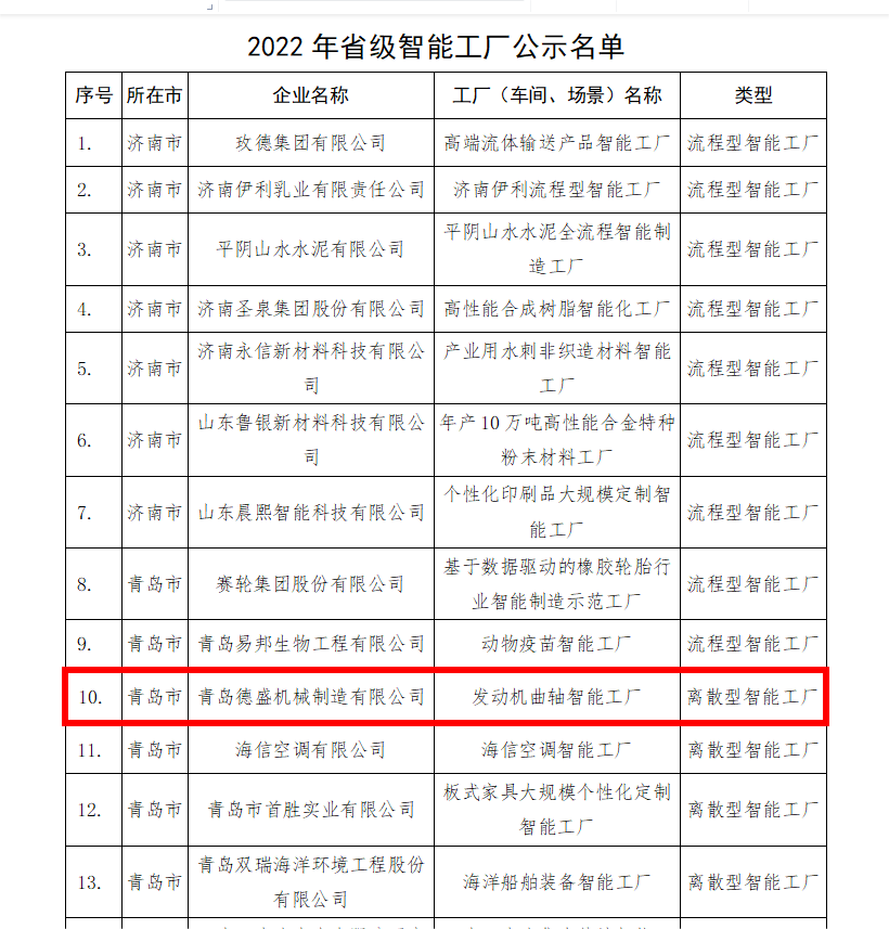 1、近日,山東省工業(yè)和信息化廳公布了2022年山東省級智能工廠(數(shù)字化車間場景)名單,我公司成功列入山東省智能工廠。