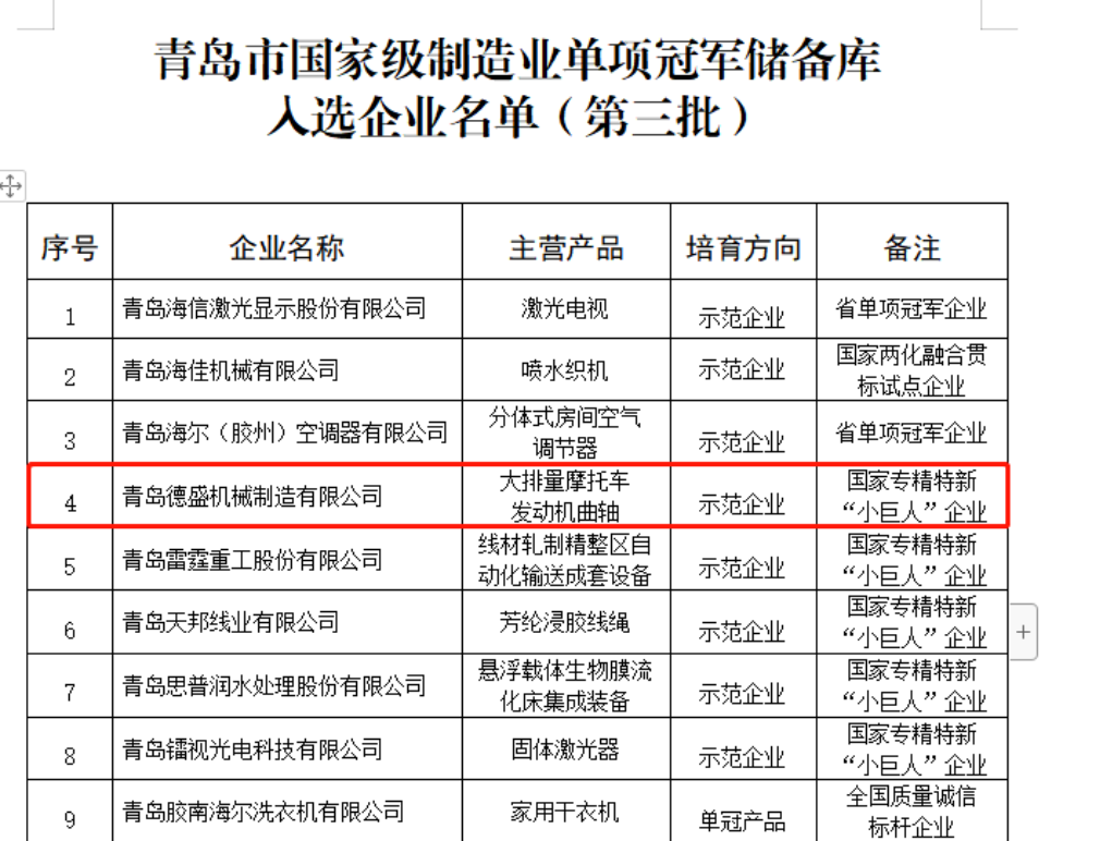 2、近日,青島市工業(yè)和信息化局公布了入選青島市國家級制造業(yè)單項(xiàng)冠軍儲備庫企業(yè)名單(第三批),我公司成功入選。